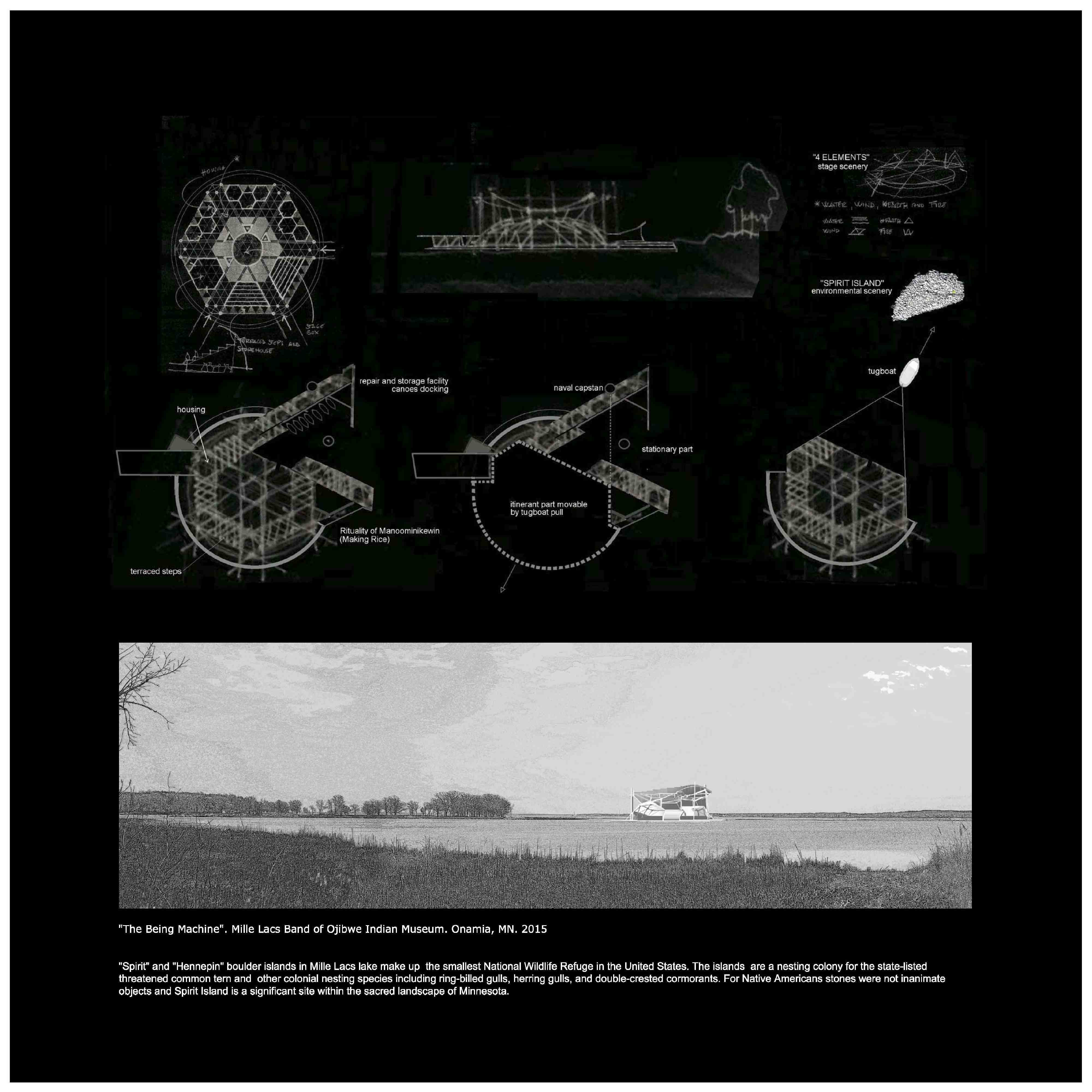 "The Being Machine" theatrical piece in the form of acting dancing and singing, merges the itinerant meta-architecture-scenery of the Floating Island with the stationary environment of Mille Lacs Spirit Island and portrays 4 main characters within three worlds or three cultures: